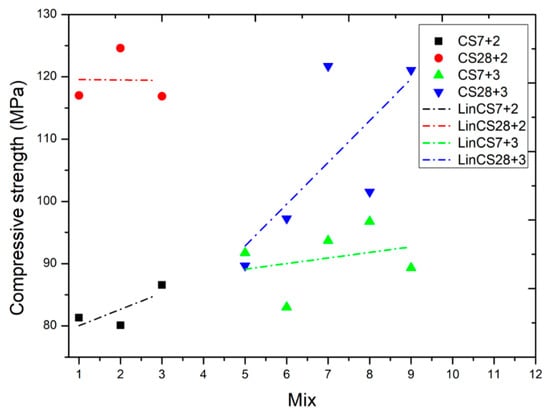 Figure 14 sets out the results provide in the table above. By analyzing the results of the group of Mixtures 1–3 with two additions, with a lower cement content and less compactness than the group of Mixtures 5–9 with three additions, with a higher cement content and greater compactness, it may be determined that greater compactness in the mixture does not lead to greater strength, although mixtures with greater compactness may have a greater durability.
