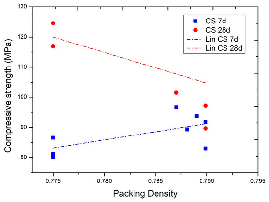 Designs were established with sand S3 and sand S1 and with a maximum of three additions. The percentage volume of cement was established as between 35.2% and 43.3%. The compaction index was established at K = 6.45, which was slightly lower than the wet compactness value and close to the K = 6.7–7 value used in self-compacting concrete [36]. The maximum compactness was achieved with the combination of three additions and nanoadditions, filler or metakaolin + silica fume + nanosilica (starting with value five in Table 3). The maximum compactness value, φ = 0.7899, was obtained with the combination of filler + silica fume + nanosilica, a value that was close to that achieved with the mixture of metakaolin + silica fume + nanosilica (φ = 0.7881) with both mixtures having the same cement content. It can be seen that the use of a higher number of additions with smaller particle sizes achieved higher compactness. In summary, all the models described above seek to increase compactness as the main premise for achieving higher strength. However, as will be seen in the following paragraphs, this should not be the only premise to search for.