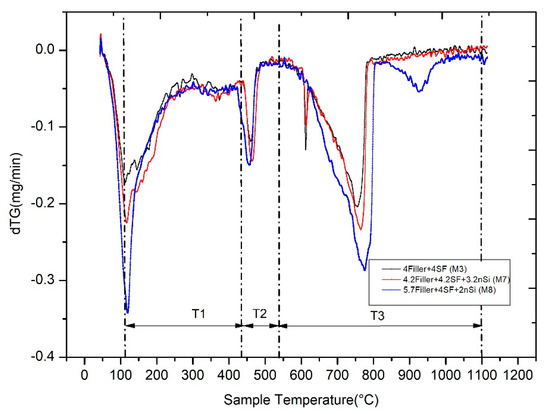 Plotting the derivative of the weight loss or what is the same the speed of weight loss (dTG) vs. temperature is more useful than the representation of the weight loss (TG) vs. temperature as it allows, in a way, a more clear and unequivocal identification of the dif- ferment start and end temperatures of different processes of weight loss with temperature. From the temperatures selected for the representation of dTG vs. TG, the quantification of the weight loss with the temperature associated with the different reactions that occur in the cement was carried out. Figure 17 shows the dTG vs. temperature of Mixtures 3, 7 and 8. Based on the methods proposed by Bhatty [53], Pane et al. [54] and Monteagudo et al. [55], various regions of dehydration, Ldh (region T1), dehydroxylation, Ldx (region T2) and decarbonation, Ldc (region T3), are highlighted in Figure 17.