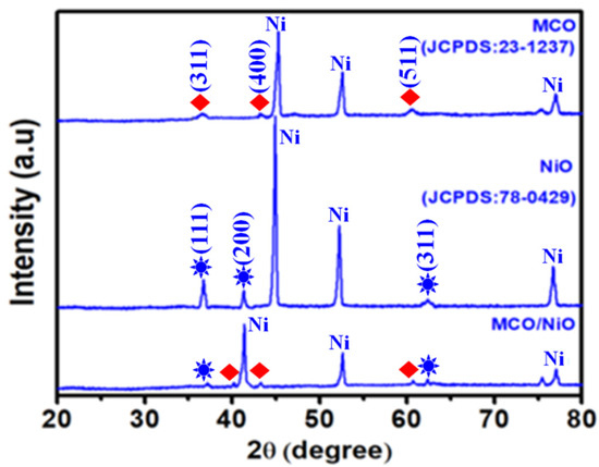 XRD was used to analyze the composition and phase structure of the as-synthesized composite. As can be seen in Figure 1, the XRD patterns of the as-prepared MCO precursor illustrated the corresponding peaks at (311), (400), and (511) that were correlated with the JCPDS: 23-1237 [23]. At the same time, the NiO precursor peaks were observed at (111), (200), and (311) and well matched with the JCPDS: 78-0429 [24]. Further, the MCO/NiO composite strongly displayed all the peaks of both MCO and NiO samples, which suggest that the as-synthesized composite has pure phases and is crystalline in nature.