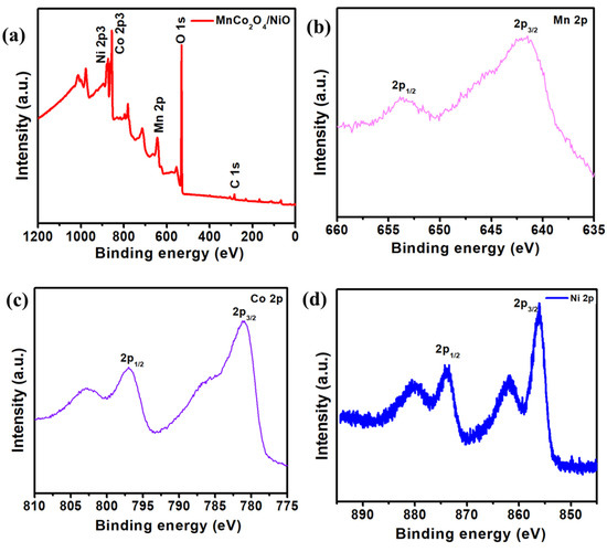 (a) XPS survey spectrum of the MCO/NiO composite. High resolution XPS spectra of the (b) Mn 2p, (c) Co 2p, and (d) Ni 2p.