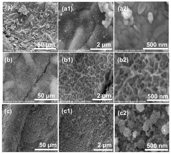FE-SEM images (a,a1,a2) of MCO, (b,b1,b2) of NiO, and (c,c1,c2) of MCO/NiO under different magnifications.