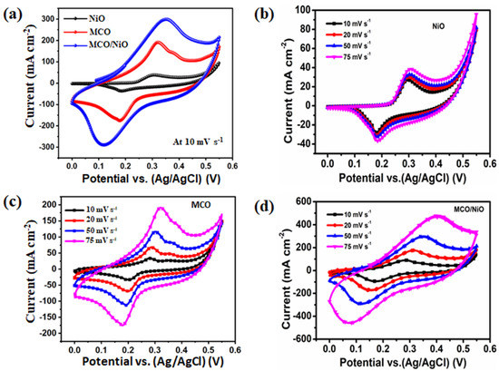 (a) Comparison of CV curves of MCO, NiO, and MCO/NiO electrodes at a scan rate of 10 mV s−1, CV curves of the (b) NiO, (c) MCO, and (d) MCO/NiO electrodes at various scan rates.