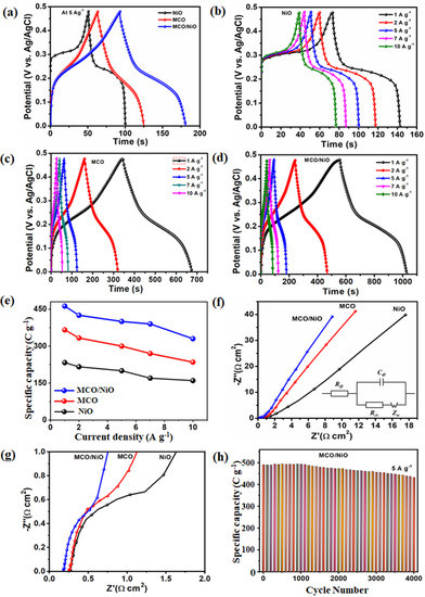 In addition, GCD tests were performed at various current densities with a potential ranging from 0 to 0.48 V to compare the MCO/NiO electrode’s high capacity output with those of the other electrodes. The GCD plots of the MCO, NiO, and MCO/NiO electrodes at 5 A g−1 are shown in Figure 5a. The non-capacitive Faradaic redox battery-type properties of both electrodes are visible on the GCD plateaus, which are distinct from the inverted “V” shapes of EDLC materials and hence comply with the CV performance. Owing to the synergistic effect of two-material electrodes, the MCO/NiO electrode had a longer charge–discharge time cycle than that of each of MCO and NiO electrodes. The GCD plots of the MCO, NiO, and MCO/NiO at different current densities of 1, 2, 5, 7, and 10 A g−1 are shown in Figure 5b–d.