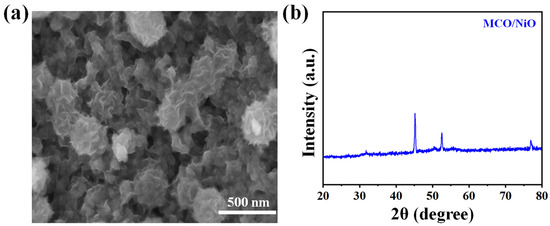 After cycling stability test, (a) SEM, and (b) XRD of the MCO/NiO composite electrode material.