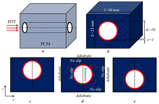 The studied configurations and the fixed boundary conditions are presented in Figure 1. A cylindrical tube is located inside a rectangular cavity (30/25 mm) filled with NEPCM, and the HTF passes through the tube to ensure the melting of the NEPCM. The present investigation concerns the influence of adding Al2O3 nanoparticles at various concentrations on the melting process. Three positions of the HTF tube are considered, as presented in Figure 1c,d. The configuration is considered as 2D-axisymmetric to reduce the calculation time. The proprieties of the PCM (n-Octadecane), the nanoparticles (Al2O3), and the inner-tube wall are presented in Table 1.