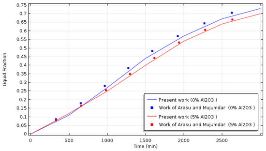 A validation test was managed by comparing the present model and previously published results. Figure 3 presents the comparison of the liquid fraction obtained by the present model and the liquid fraction of the work of Arasu and Mujumdar [12]; the comparison is showing an acceptable agreement with the findings of reference [12].