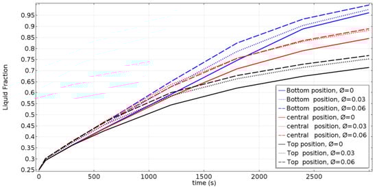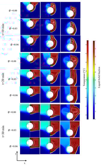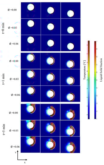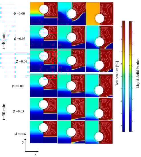Plots of the liquid fraction, thermal field, and streamlines at different time steps (t = 0, 1, 10, 20, 30, 40, and 50 min) with different nanoparticles concentrations ( = 0.00, 0.03, and 0.06) and for the three considered geometrical configurations (top, center, and bottom positions of the tube) are shown in Figure 4. The results show that the liquid fraction of all the nanoparticle volume fractions and the different positions of the inner tube behave generally in the same way. The liquid fraction begins to grow from the inner tube towards the adiabatic walls.