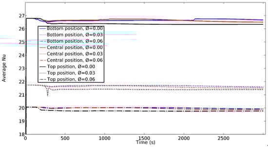 Figure 5 shows the temporal evolution of the average Nusselt number () on the outer wall of the tube for all the considered positions of the tube and the different concentrations of nanoparticles ( = 0, 0.03, and 0.06).