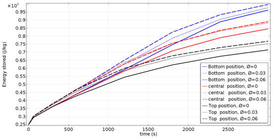 Figure 7 shows the temporal variation of the thermal energy stored by the NEPCM. The stored energy increases with time in all cases, as presented in Figure 7. It can also be noted that the energy storage rate follows the same pattern of evolution of the melting rate. The rate of charge of stored energy increases with the displacement of the inner tube towards the bottom of the cavity, and with the increase of the concentration of nanoparticles. This improvement is due to the increased heat distribution in the NEPCM.