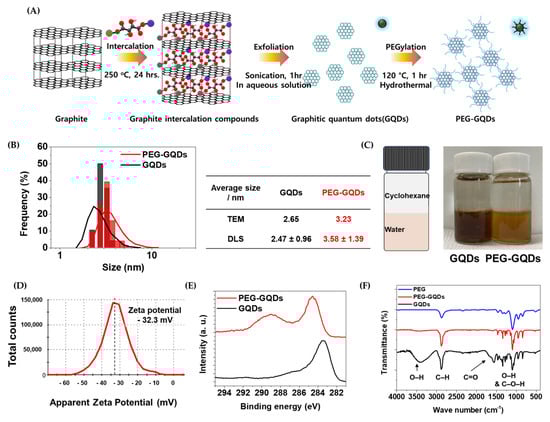 (A) Schematic illustration of the GQDs and PEG-GQDs fabrication. (B) Particle size distribution taken from transmission electron microscope (TEM) images (bar) and Dynamic light scattering (DLS, line) of the GQDs and PEG-GQDs. (C) Photograph of cyclohexane/water hydrophilicity/miscibility test. (D) Zeta potential of PEG-GQDs. (E) X-ray photoelectron spectroscopy (XPS) C 1s peaks. (F) Fourier-transform infrared spectroscopy (FTIR) of the PEG, GQDs, and PEG-GQDs.