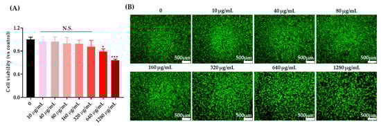 After seeding rNSPC for 24 h, various concentrations of PEG-GQDs (0, 10, 40, 80, 160, 320, 640, and 1280 µg/mL) were added and then incubated with cells for an additional 24 h. As shown in Figure 3, the cell viability and live-dead staining pictures indicated that the PEG-GQDs did not show noticeable toxicity to rNSPCs up to 320 µg/mL. It is consistent with other researchers’ studies [22,23]. Yu Chong et al. [22] also reported the positive biocompatibility of GQD–PEG in vivo even under a multi-dosing situation. It indicated the possibility of applying PEG-GQDs for neural regeneration and even further clinical studies.