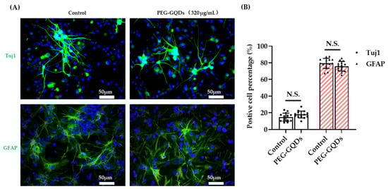 The differentiation potential of rNSPCs with internalized nanomaterials is an essential characteristic for stem cell based therapy that should not be changed by the containing material for further bio applications. To investigate whether PEG-GQDs impair the differentiation potential of rNSPCs, we induced a differentiation process of rNSPCs. After 7 days of differentiation, neuron-specific class III beta-tubulin (Tuj1) and glial fibrillary acidic protein (GFAP) were examined using immunocytochemistry. As shown in Figure 5, no significant difference was observed between the control and 320 µg/mL PEG-GQDs treated groups. The rNSPCs with the PEG-GQDs were also able to differentiate into neurons and glial cells (Figure 5A). Moreover, Tuj1 positive stained neurons showed good morphology of elongated cell shapes with long neurite outgrowth and formed an excellent interconnected neuronal network [48]. Moreover, there were no notable differences in the percentages of neurons or glial cells between the two groups (Figure 5B). The results demonstrated that 320 µg/mL PEG-GQDs treatment did not affect the differentiation process of rNSPCs towards both neurons and glial cells. The results in this study were consistent with the study of Weihu Shang et al. They reported that 25 µg/mL GQD treatment did not affect the differentiation percentages of both neurons and glial cells of human neural stem cells [21]. It is obvious that our PEG-GQDs did not influence the neural stem cell differentiation even at the concentration of the materials 10 times higher than the previous reports.