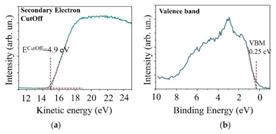 The XPS measurements were used to determine the mutual arrangement of valence bands (VB) in the semiconductor heterostructures. The employed technique is widely used to study the band structure in heterojunction the formation of which can cause a change in the energy distribution of electrons [35,39,40]. The leading edge of the valence band spectrum was approximated by a linear function using the least-square fit of the leading edge of the VB spectra. The position of the valence band maximum (VBM) was determined as the intersection of the approximating linear function and the baseline. Determining the shift between the core levels of semiconductors in the heterojunction made it possible to calculate the valence band offset (VBO).