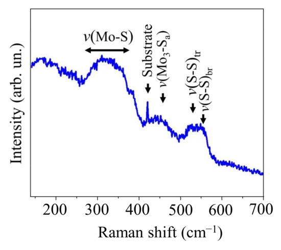 The local packing of atoms in the MoSx~4 film was investigated by MRS. It can be seen in Figure 12 that the Raman spectrum of the film consists of a set of broadened strips, whose position correlates well with that of the bands in the Raman spectrum of a catalytic molybdenum sulfide film obtained by chemical synthesis in a solution [13] and by reactive magnetron sputtering [47]. The spectrum had two clear broadened peaks at ~525 and ~550 cm−1, which were accounted for by the vibrational modes ν(S-S)tr and ν(S-S)br respectively in Mo3S13/Mo3S12 clusters. The peak at ~450 cm−1 is explained by the vibrations of apical S in Mo3S13 clusters. A broad band in the range 250–400 cm−1 is characteristic of an amorphous featureless structure of MoSx. Thus, the selected regime of on-axis RPLD made it possible to obtain thin layers of an amorphous molybdenum sulfide containing Mo3S13/Mo3S12 clusters on the surface of a nanostructured WSe2 film. The high electrocatalytic activity of such an amorphous molybdenum sulfide could contribute to a photo-assisted HER if the flux of nonequilibrium carriers (electrons) through the interface with WSe2 was sufficient.
