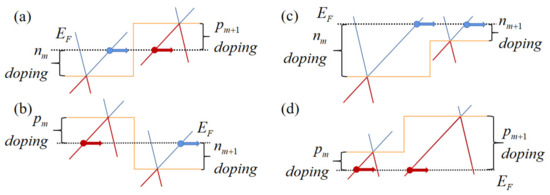 Suppose that an n-doped region m is next to a p-doped region and carriers go through from n-doped region to p-doped region like in Figure 2a, the wave functions at interface can be connected in the way of