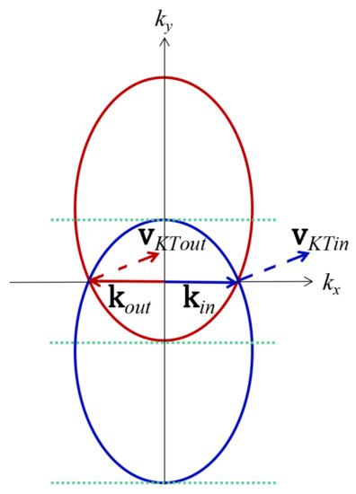 Here, , denoting the conduction and valence band, respectively. For 8- borophene, the shape of Fermi surface for the fixing energy is elliptical with eccentricity e determined by , and , which differs from the circular shape with radius of graphene. We can rewrite Equation (2) in following way [39,57]: