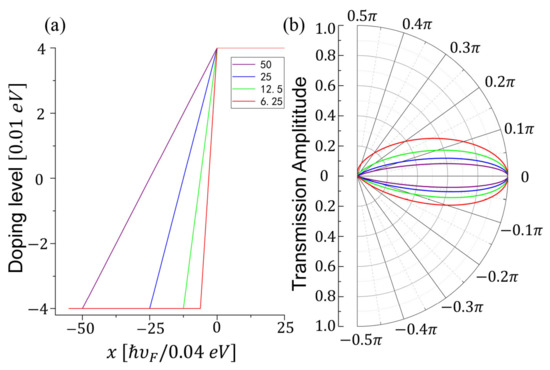 where is the doping level in m region and may take positive or negative imaginary values when . The phase in Equation (11) is defined as the wave function phase difference between the two sublattices. The sign of the defines the propagating direction of the carriers. Without loss of generality, we can take only positive imaginary value for the transmission matrix, which means the positive propagating direction of electrons is defined on right-going state. Here, the potential profile in adjacent regions within NP junction is linear but not rectangular; we treat the potential as a series of step potential to solve the tunneling problems by the transmission matrices. For convenience, we choose eV to be the length unit and eV to be the energy unit, where eV is the maximum of the doping level.