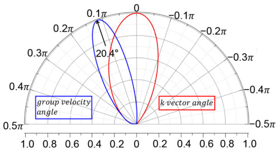 Angular transmission amplitude for k vector (red) and for group velocity (blue). The doping level is eV and the length of varying region is a.