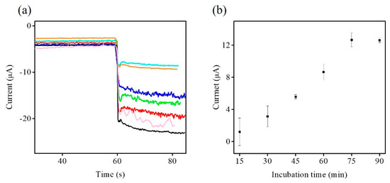 (a) Amperometric I-t curve of CHIT/Zn-Co-S@G/GCE in 0.1 M PBS in 5 mM H2O2 with different CA19-9 incubation times; 0 min (black line), 15 min (magenta line), 30 min (red line), 45 min (green line), 60 min (blue line), 75 min (cyan line), and 90 min (orange line) in CA19-9 at 100 U·mL−1. (b) The relationship between response current and CA19-9 incubation time in Figure 7a.