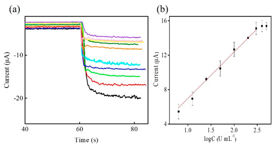 (a) Amperometric I-t curve of BSA/anti-CA19-9/GA/CHIT/Zn-Co-S@G/GCE at applied potential of −0.5 V in 0.1 M PBS in 5 mM H2O2 with successive addition of various CA19-9 concentrations; 0 U·mL−1 (black line), 6.3 U·mL−1 (red line), 12.5 U·mL−1 (green line), 25 U·mL−1 (blue line), 50 U·mL−1 (cyan line), 100 U·mL−1 (orange line), 200 U·mL−1 (olive line), 300 U·mL−1 (yellow line), 400 U·mL−1 (magenta line), and 500 U·mL−1 (purple line). (b) The linear range of BSA/anti-CA19-9/GA/CHIT/Zn-Co-S@G/GCE in Figure 8a.