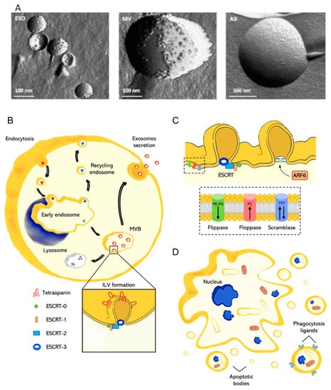 (A) EV classification and biogenesis: freeze-fracture transmission electron microscopy of the different EV types, reprinted with permission from ref. [25]. Copyright (2017 Elsevier). (B) Mechanisms of biogenesis of EXOs, with emphasis on the role of tetraspanins and ESCRT complexes; (C) mechanisms of MV biogenesis, with emphasis on the role of ARF6, ESCRT complexes, flippase, floppase, and scramblase. (D) Mechanism of formation of apoptotic bodies.