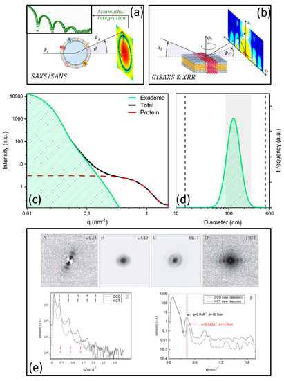 SAXS and SANS are highly versatile techniques that can be used to retrieve the low-resolution shape of macromolecules in solution together with compositional information derived mainly from the tunable neutron contrast [98,108,109]. At variance with diffraction techniques, which require at least some degree of crystallinity, SAS can be applied to non-crystalline samples, a characteristic that makes it attractive for studying exosomes (EXOs).