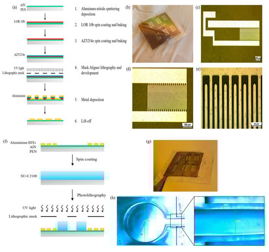 - Jin, H.; Zhou, J.; He, X.; Wang, W.; Guo, H.; Dong, S.; Wang, D.; Xu, Y.; Geng, J.; Luo, J.K.; et al. Flexible surface acoustic wave resonators built on disposable plastic film for electronics and lab-on-a-chip applications. Sci. Rep. 2013, 3, 2140. [Google Scholar] [CrossRef] [PubMed]