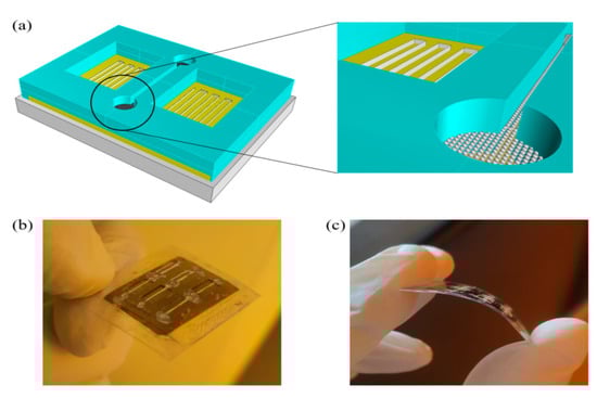 Tridimensional model of finished device (a); photo of the fabricated comformable PEN SAW-based device (b,c).