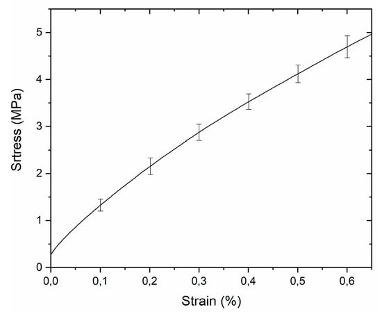 Mechanical characterization is fundamental to verify the conformability of a new hybrid material to human skin. Such devices should show the typical Young’s modulus of the skin, which can be obtained through flexible substrates []. For this reason, the mechanical properties of the new PEN/SU-8 hybrid device (tPEN ~ 125 μm, tSU-8 ~ 300 μm) were assessed with a dynamic mechanical analyzer (DMA Q800, TA Instruments, USA). In particular, tensile strain was investigated (Figure 3).