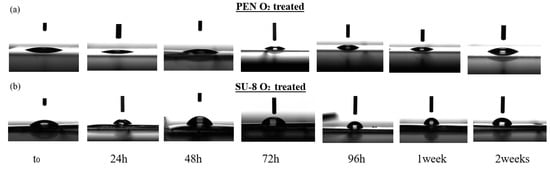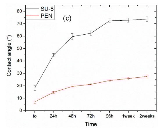 Images of PEN (a) and SU-8 (b) aging contact angle test and relative measurements at t0, 24 h, 48 h, 72 h, 96 h, one and two weeks (c).