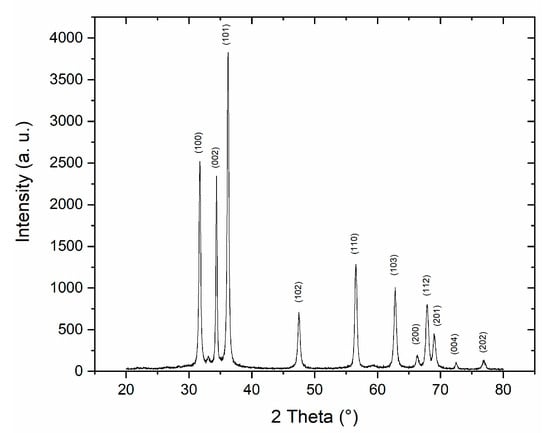 The ZnO NPs have been characterized using X-ray diffraction (XR) to evaluate the crystallographic quality of the sample using a Rigaku D-Max/Ultima (Tokyo, Japan) working at 40 kV with a Cu Kα radiation. In the XRD pattern (Figure 5), the resulting peaks correspond to the pure hexagonal wurtzite phase of ZnO []. These results allowed us to see that no other ZnO phases or impurities are present in the sample.