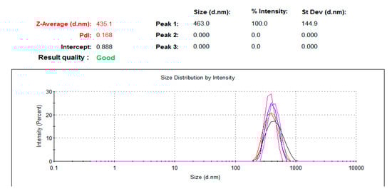 NPs dimensions, dependent on the speed of the addition of zinc acetate to NaOH solution during the synthesis [], was evaluated using a dynamic light scattering (DLS) test through a Zetasizer Nano (ZS) (Malvern Panalytical, Malvern, UK)). The concentration of the samples was 1 mg/mL in a deionized water solution, and before the test they were sonicated for 90 min. The results show NPs of 435.1 ± 26.4 nm (Figure 6). Only one peak in the distribution was observed, demonstrating a uniform distribution of the dimensions.