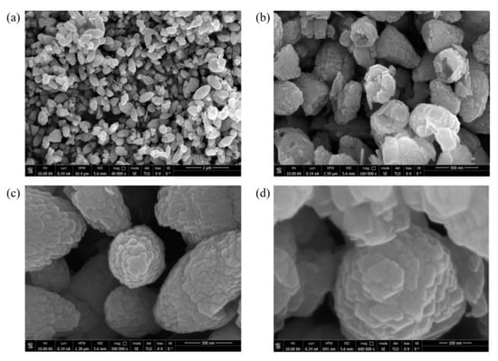 SEM images of the ZnO NPs at different magnifications; 40,000× (a), 160,000× (b), 300,000× (c) and 600,000× (d).