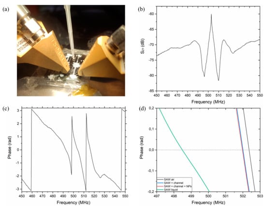 Experimental setup, used to study the electroacoustic response of the SAW devices (a), transfer function amplitude S21 of the PEN device in air (b) and its phase response in air (c); changes in phase response of SAW device in air, after microchannel fabrication, after NPs deposition and the microchannel was filled with liquid (d).
