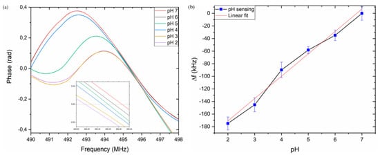 Six solutions from pH = 7 to pH = 2, with a step of one unit, have been used to evaluate the electroacoustic response in the L-SAW resonance. The presence of a liquid medium induces a shift of about 3.7 MHz to the frequency of the device in air (Figure 8d). The resonance center frequency obtained with the pH = 7 solution has been used as a reference frequency, f0, in the experiment. In Figure 9a, the phase responses for PEN devices at different pH values are shown. The inset in Figure 9a clearly shows the center frequency shift for the different pH values. Figure 9b reports the resonance shift (Δf = f − f0), where f0 represents the center frequency at pH = 7 and f the center frequency of the other pH values. As expected, the center frequency of the sensor response decreases for lower pH levels due to the increase in ZnO NPs conductivity. The same device has been used to perform measurements at different pH values, after washing and drying the microchannel after each measurement, demonstrating that the shifts are reversible, and the device is reusable. In fact, according to Oh et al., no dissolution of ZnO NPs has been observed after exposure to a strong acid [].