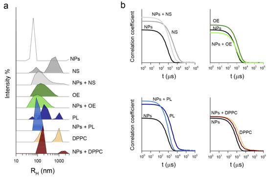 Interaction of PHA nanoparticles with pulmonary surfactant-related materials as determined by DLS. (a) Size distributions and (b) correlograms. Materials tested in the absence or presence of PHA NPs included NS (native surfactant); OE (the reconstituted organic extract of pulmonary surfactant); PL, a suspension of the lipid mixture DPPC/POPG 7:3 (w/w); and DPPC multilamellar vesicles. DLS measurements were performed at 25.0 ± 0.1 °C and a lipid/nanomaterial weight ratio of 1:0.33.