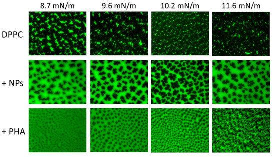 Epifluorescence microscopy of interfacial DPPC films in the absence and presence of NPs and PHA. Images of DPPC, alone and in the presence of NPs or PHA molecules (lipid/nanomaterial or PHA ratio of 1:0.33), at different surface pressures were obtained upon transfer of the corresponding interfacial films onto glass slides and observation under an epifluorescence microscope. DPPC films were doped with NBD-PC, which partitions preferentially into the LE phase.
