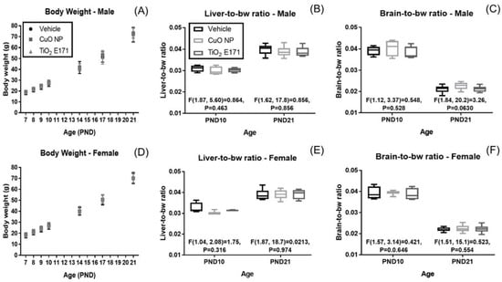 Body weight (bw), liver-to-bw ratio, and brain-to-bw ratio for male (A–C) and female (D–F) rat pups dosed between PND 7–10. No changes were observed in body weight as a result of NP oral dosing. While NP administration did not cause in organ-to-bw ratio changes, a clear difference was observed between ages PND 10 and PND 21. Body weight is presented as mean ± standard deviation. Box and whisker plots of organ-to-bw ratio data with statistical F values are shown.