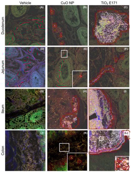 Enhanced darkfield microscopy (EDM) and hyperspectral imaging (HSI) of intestinal cross sections of AB-PAS stained duodenum (A–C), jejunum (D–F), ileum (G–I), and colon (J–L) tissue for rat pups dosed between PND 7–10 with vehicle control (A,D,G,J), CuO NP (B,E,H,K), or TiO2 E171 (C,F,I,L). Mapped NPs (individual pixels) are shown with different colors, and areas with mapped NPs are highlighted with red circles and polygons.