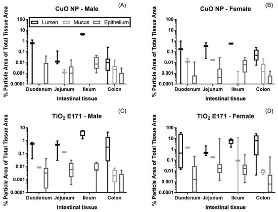 The area of NPs was calculated for each of the three different tissue areas (lumen, mucus, and epithelium), and expressed as percent particle area of total tissue area (Figure 3). For CuO NP (Figure 3A,B) the highest percentage of particle area was observed in the lumen for both small and large intestines collected from both male and female pups. Mucus areas in the small intestinal were few, but in the large intestine, the percentage of particles was higher in the mucus than in the underlying epithelium tissue. CuO NP were observed at low levels in the epithelium for both the small and large intestine; the percentage of NPs in the epithelium of the small intestinal tract was higher than the epithelium in the large intestinal tract. Also, for TiO2 E171 (Figure 3C,D) the highest percentage of particles were observed in the lumen for both small and large intestines collected from male and female pups.