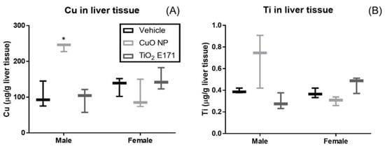 ICP-MS analysis of liver tissues collected four hours after administration of the last dose were analyzed using a two-way ANOVA, showing an interaction between gender and dose group for hepatic Cu concentration (F(2,4) = 24.93, p = 0.0055) and Ti concentration (F(2,4) = 8.446, p = 0.0367). While gender (Cu: F(1,2) = 3.57, p = 0.199; Ti: F(1,2) = 6.02, p = 0.134) and dose group (Cu: F(2,4) = 2.98, p = 0.161; Ti: F(2,4) = 1.35, p = 0.357) alone were not sources of variation. ICP-MS analysis demonstrated uptake of Cu in male pups (p = 0.0421), but not female pups (Figure 4). There was no increase in liver Ti concentration after TiO2 E171 administration.
