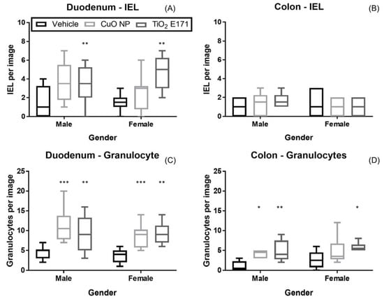 Immune cells, intraepithelial lymphocytes (IEL) (A,B) and granulocytes (C,D) located in H&E stained Swiss roll tissue sections of the duodenum (A, C) and colon (B, D) following oral administration of vehicle control, CuO NP, or TiO2 E171 in male and female pups at PND 10. Box and whisker plots of number of immune cells per image are shown. Statistical difference between vehicle control and dosing groups are noted by asterisk(s), p-value < 0.05 is noted with one asterisk, p-value < 0.01 with two asterisks, and p-value < 0.001 with three asterisks.