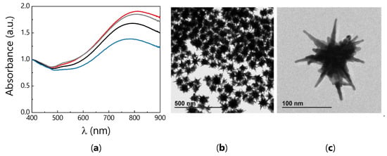 Plasmonic AuNSs were synthesized following the colloidal seed-mediated growth method (Materials and Methods section). Citrate seeds were used to grow AuNSs, later functionalized with PEG-SH. Polyethylene glycol was used to confer high stability and biocompatibility to the nanoparticles, avoiding their aggregation at physiological ionic strengths [31]. The AuNSs exhibited a broad LSPR band centered at 812 nm in water (Figure 1a), which can be assigned to a dipolar resonance localized at the tips [21]. A slight blue shift of the LSPR band to 805 nm was observed in HEPES-buffered medium, as a consequence of the changes in the chemical environment [32]. AuNSs with cores of 55.0 ± 10.0 nm and spikes of 50 ± 25 nm were visualized by TEM (Figure 1b,c).
