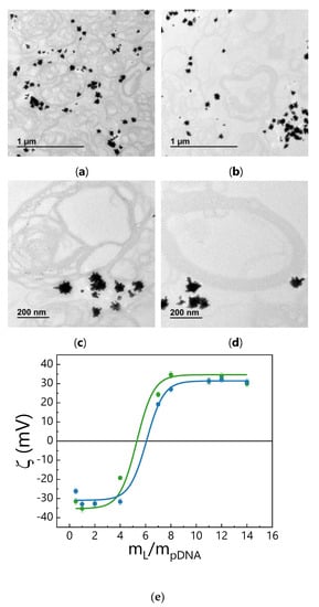 Stained TEM micrographs of the liposome-AuNS (a,c) and lipoplex-AuNS (b,d) systems and (e) ζ–potential versus mL/mpDNA of the lipoplex (green points) and lipoplex-AuNS (blue points) systems.