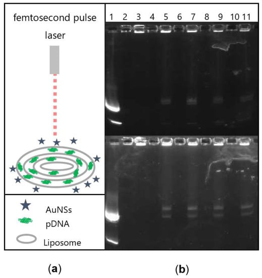 (a) Scheme of irradiation and (b) Agarose gel electrophoresis of lipoplex-AuNS systems under non-irradiated (lanes 2, 4, 6, 8 and 10) and irradiated (lanes 3, 5, 7, 9 and 11) conditions, at 400 mW (top panel) and 700 mW (bottom panel) for 5 min. The lipoplex-AuNS systems were prepared at different AuNS concentrations: 20 pM (lanes 2–3), 50 pM (lanes 4–5), 100 pM (lanes 6–7), 150 pM (lanes 8–9) and 200 pM (lanes 10–11). Free pDNA was used as the control (lane 1).