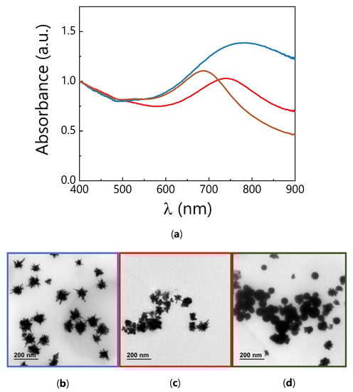 The localized surface plasmon resonances (LSPRs) of gold nanoparticles (AuNPs) render them with strong absorption efficiency and attractive photothermal properties that can be activated by external laser excitation [18]. As examples of biomedical applications, the irradiation of AuNPs with lasers induces the release of controlled quantities of antitumor drugs into cancer cells [19], or kills cancer cells in the case of plasmonic photothermal therapies (PPTT) [20]. In particular, plasmonic gold nanostars (AuNSs) are especially appealing because they exhibit broad LSPR bands, displaying very high electromagnetic fields localized at the tips, much larger than those displayed by other morphologies such as gold nanospheres or nanorods [21]. Additionally, the LSPR of AuNSs can be tuned to the near-infrared (NIR) region as a function of the width, length and number of spikes [22]. The NIR region is interesting from a biomedical point of view due to the well-known first (650–950 nm) and second (1000–1350 nm) biological windows, where the blood and water within organisms present low NIR absorption and scattering [23,24,25]. As an example, we have shown the use of AuNSs with an LSPR band centered at 800 nm for efficient PPTT on melanoma cells by femtosecond laser irradiation [26].