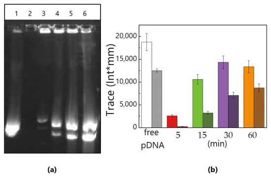 (a) Agarose gel electrophoresis of the lipoplex-AuNS system (100 pM AuNSs) irradiated at 400 mW at different times: 5 min (lane 3), 15 min (lane 4), 30 min (lane 5) and 60 min (lane 6). Lane 1: free pDNA as the control; lane 2: non-irradiated lipoplex-AuNS system and (b) Quantification of the pDNA release as a function of the time of irradiation (min). Traces (Int*mm) of the fluorescent bands of coiled (unstriped bars) and supercoiled (striped bars) pDNA conformations.