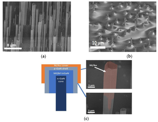 The GaN MWs with core–shell InGaN/GaN multiple quantum wells (MQWs) were grown by metal-organic vapor phase epitaxy (MOVPE) on sapphire substrates [31,32]. In the first stage, n-doped GaN MWs were grown based on high silane flux that passivates the sidewall surfaces by the spontaneous formation of SiNx ultrathin layer [33]. The GaN MWs are highly n-doped (estimated as ~1020 cm−3 [34]) with a typical length of 10 μm and a diameter in the range of 0.7–1.5 µm. In the second stage, another non-intentionally doped GaN segment of about 7 μm length was grown without silane flux leading to a reduced doping concentration (about 1018 cm−3 [35]). The active MQW region was deposited directly on the MW sidewall surface by switching from axial to radial growth thanks to the reduction of the growth temperature from 1040 °C to 750 °C. Due to the presence of the SiNx layer around the wire base, the radial growth is inhibited in the lower wire part and the core/shell heterostructure is only formed around the upper non-intentionally doped wire part, as described in [36,37]. The active region consisted of seven periods of 5-nm InGaN quantum wells delimited by 10-nm-thick GaN barriers and with an indium content of 15%. The growth was pursued with the deposition of the p-GaN 100 nm-thick shell, the hole concentration is estimated to be in the 1016–1017 cm−3 range [38]. The MW density is about 5 × 106 per cm2. The MW morphology and the internal structure are illustrated in Figure 1a–c.