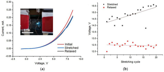 (a) I–V curves of a representative stretchable LED in initial (red line), stretched by 20% for the first time (blue line), and released (black line) states. (b) Working voltage during the stretching test of the LED for a constant injection current. Inset in (a) demonstrates a photo of the functioning stretchable LED device.